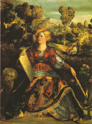 Rispetto alle opere di Dosso Dossi del periodo precedente, la composizione è di più ampio respiro..., la figura femminile è costruita seguendo le novità romane di Michelangelo e di Raffaello..., il paesaggio è dominato da una luce diffusa, che trova corrispondenza nella pittura di Giorgione..., e, infine, la posa della donna è molto vicina a quella della figura abbigliata nell'AMOR SACRO E AMOR PROFANO di Tiziano.