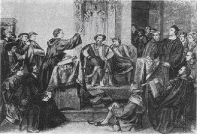 Il 12 ottobre del 1518 ebbe luogo nella casa dei Fugger il primo incontro tra Lutero e i plenipotenziari della Curia. Il cardinale Caetani, che aveva partecipato in veste di legato Pontificio a una Dieta imperiale tenutasi ad Augusta, esortò il monaco agostiniano a riconoscere i suoi errori, a rinnegarli e ad astenersi da ogni azione suscettibile di recar danno alla Chiesa. Ma Lutero non si piegò. Passò anzi al contrattacco impegnando immediatamente il sapiente generale dei Domenicani in una discussione teologica nel corso della quale ebbe occasione di esporre e di sottolineare con vigore ancor maggiore le sue idee e le sue convinzioni. Soprattutto egli sostenne senza mezzi termini la sua assoluta certezza che il peccatore potesse ottenere il perdono divino anche senza la mediazione del papa perchè, per ottenere questo perdono, non occorreva la somministrazione di alcun sacramento dal momento che, secondo lui, bastava aver fede nella possibilità di salvarsi.