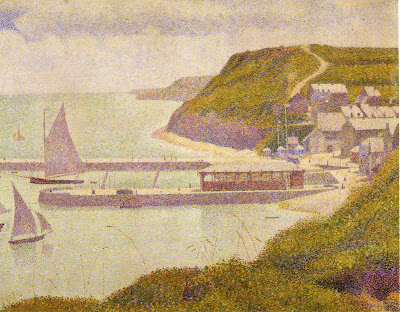 Questo attento studio "en plein air" segna un momento di continuità con l'Impressionismo, tuttavia, al contrario ad esempio di Monet, Seurat epurò le sue immagini da ogni possibile residuo della cultura romantica, ritraendo esclusivamente il villaggio..., nel caso del dipinto che presento il porto è ritratto così come appariva agli occhi dell'artista.